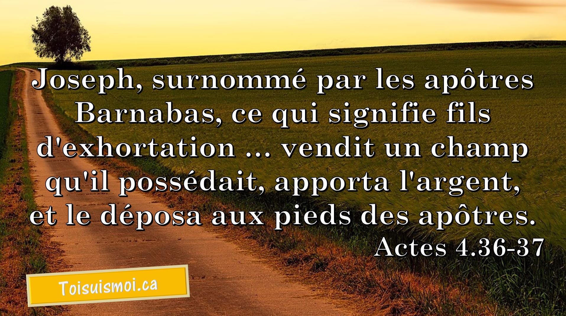 Il y avait un lévite originaire de Chypre, Joseph, surnommé Barnabé par les Apôtres, ce qui se traduit : « homme du réconfort ».