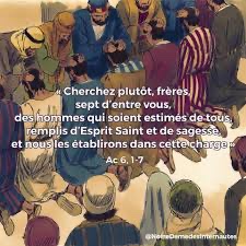 Cherchez plutôt, frères, sept d’entre vous, des hommes qui soient estimés de tous, remplis d’Esprit Saint et de sagesse, et nous les établirons dans cette charge.
