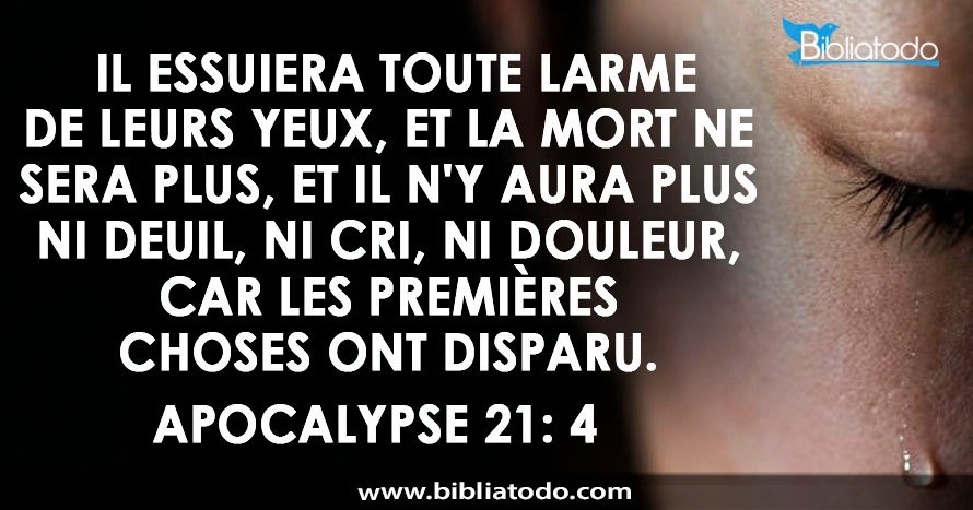 Il essuiera toute larme de leurs yeux, et la mort ne sera plus, et il n’y aura plus ni deuil, ni cri, ni douleur : ce qui était en premier s’en est allé. »