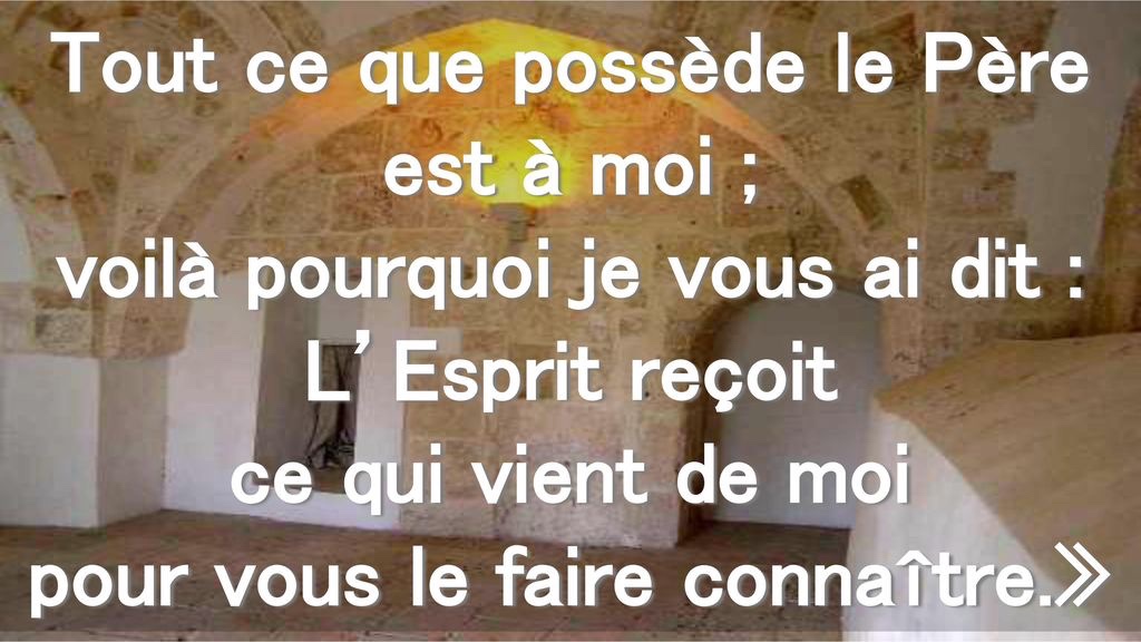 Tout ce que possède le Père est à moi ; voilà pourquoi je vous ai dit : L’Esprit reçoit ce qui vient de moi pour vous le faire connaître. »