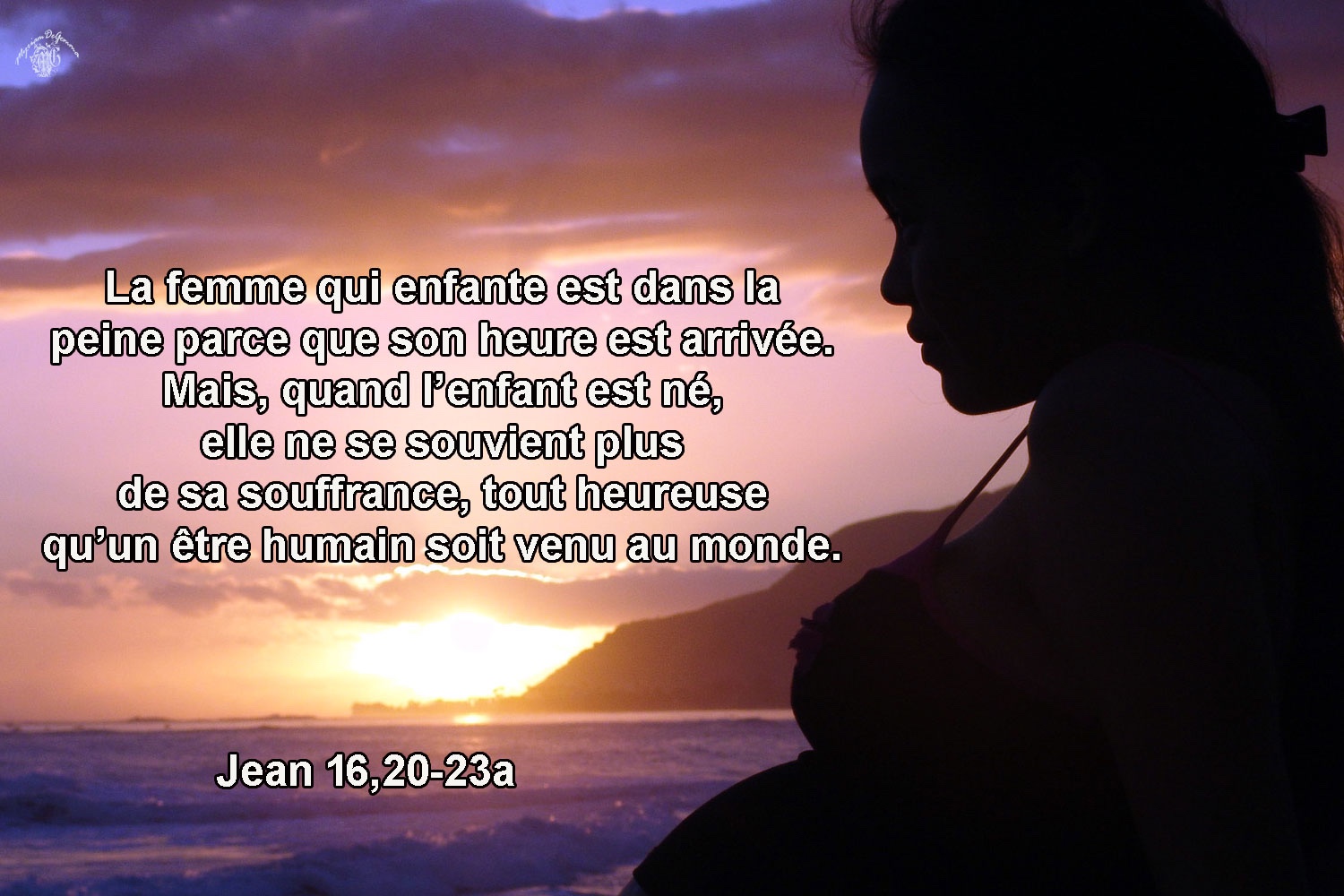 La femme qui enfante est dans la peine parce que son heure est arrivée. Mais, quand l’enfant est né, elle ne se souvient plus de sa souffrance, tout heureuse qu’un être humain soit venu au monde.