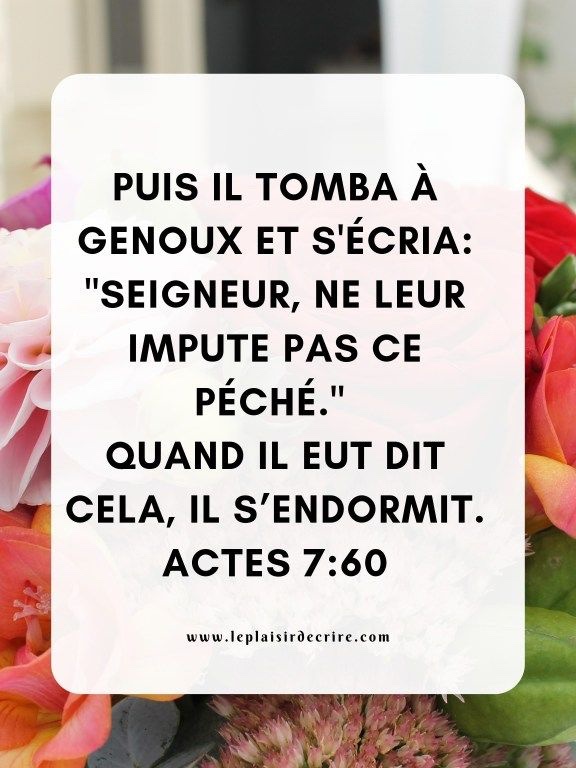Puis, se mettant à genoux, il s’écria d’une voix forte : « Seigneur, ne leur compte pas ce péché. » Et, après cette parole, il s’endormit dans la mort.