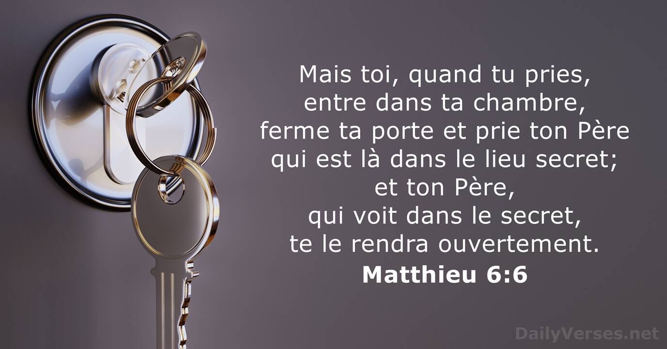 Mais toi, quand tu pries, retire-toi dans ta pièce la plus retirée, ferme la porte, et prie ton Père qui est présent dans le secret ; ton Père qui voit dans le secret te le rendra.