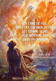 Ils étaient en train de marcher tout en parlant lorsqu’un char de feu, avec des chevaux de feu, les sépara. Alors, Élie monta au ciel dans un ouragan.