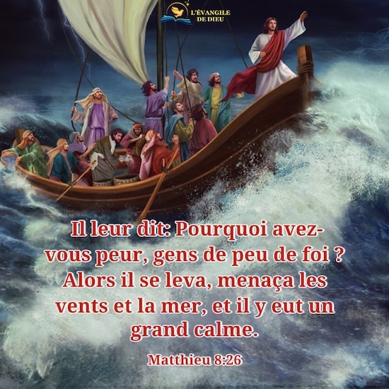 Mais il leur dit : « Pourquoi êtes-vous si craintifs, hommes de peu de foi ? » Alors, Jésus, debout, menaça les vents et la mer, et il se fit un grand calme.
