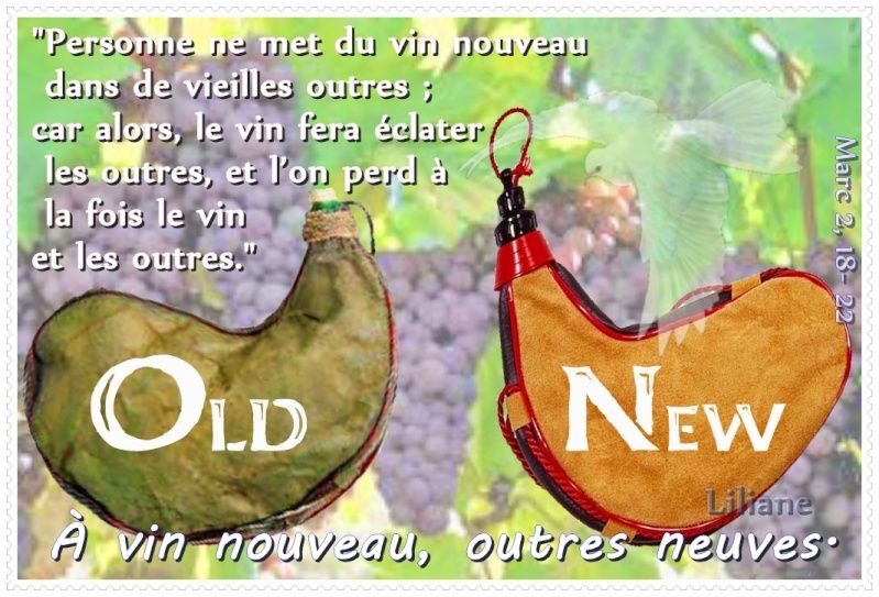 Et on ne met pas du vin nouveau dans de vieilles outres ; autrement, les outres éclatent, le vin se répand, et les outres sont perdues. Mais on met le vin nouveau dans des outres neuves, et le tout se conserve. »
