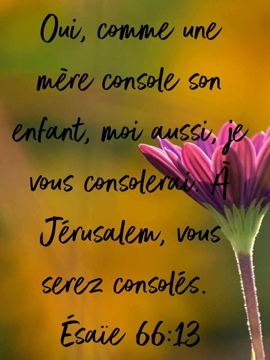 Comme un enfant que sa mère console, ainsi, je vous consolerai. Oui, dans Jérusalem, vous serez consolés.