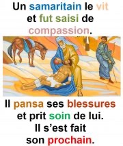 Mais un Samaritain, qui était en route, arriva près de lui ; il le vit et fut saisi de compassion.