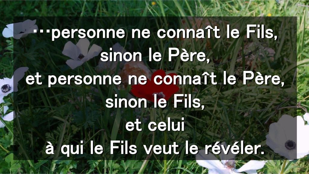 Tout m’a été remis par mon Père ; personne ne connaît le Fils, sinon le Père, et personne ne connaît le Père, sinon le Fils, et celui à qui le Fils veut le révéler. »