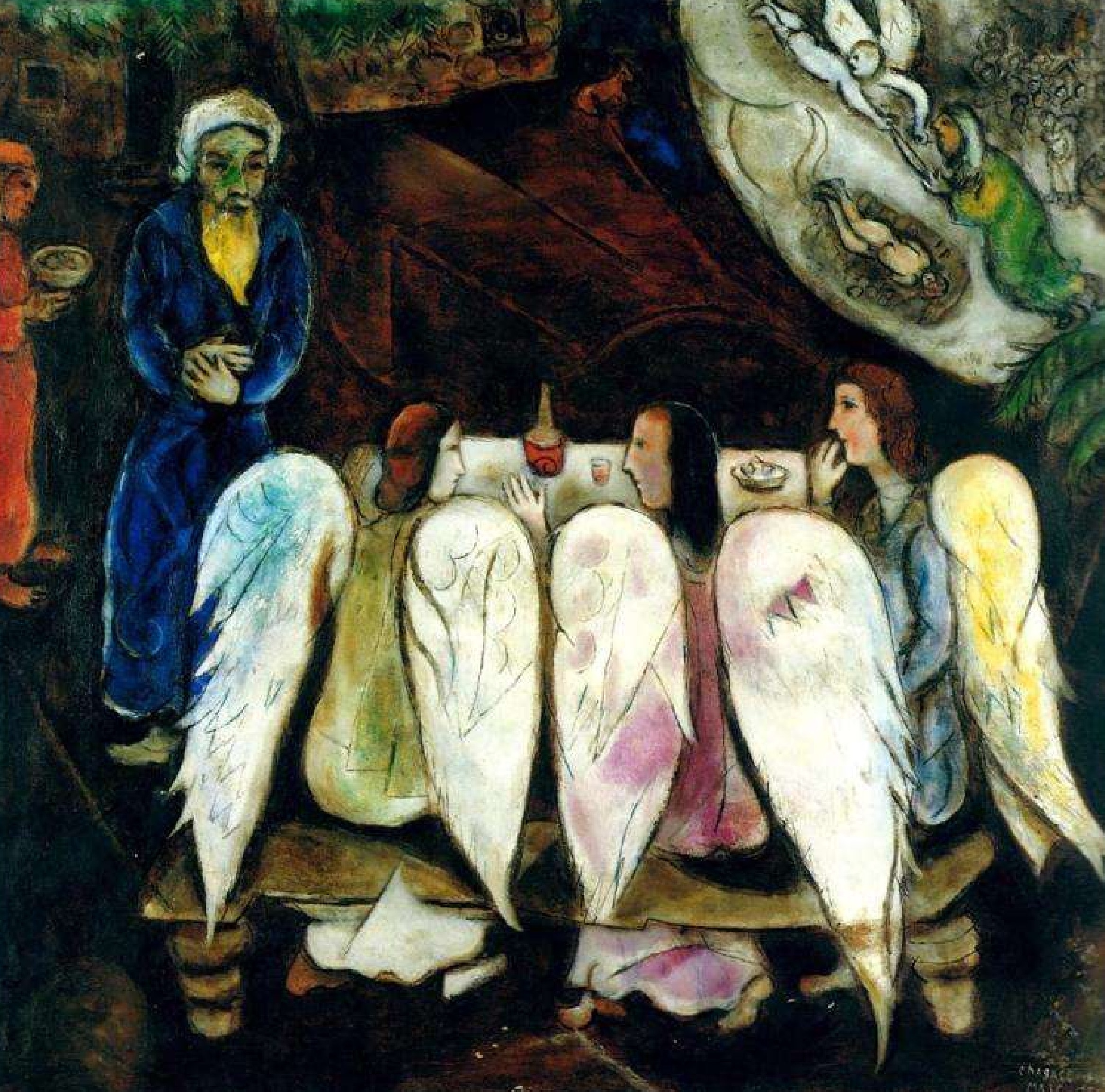 Abraham leva les yeux, et il vit trois hommes qui se tenaient debout près de lui. Dès qu’il les vit, il courut à leur rencontre depuis l’entrée de la tente et se prosterna jusqu’à terre.
