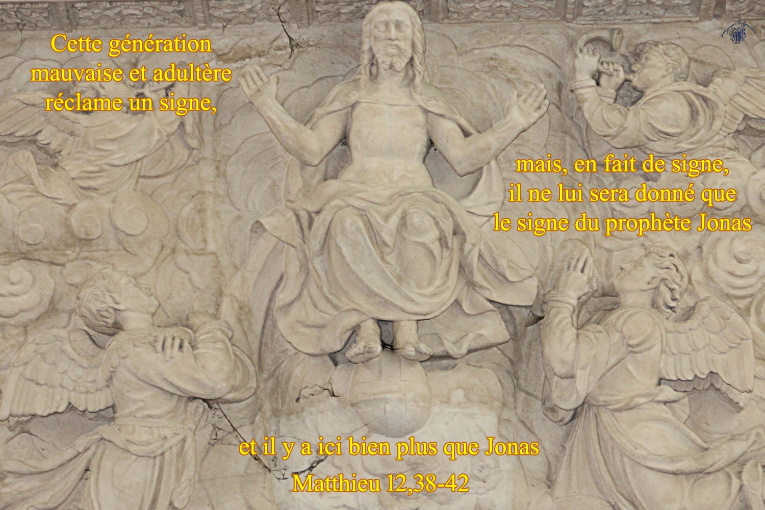 Il leur répondit : « Cette génération mauvaise et adultère réclame un signe, mais, en fait de signe, il ne lui sera donné que le signe du prophète Jonas.