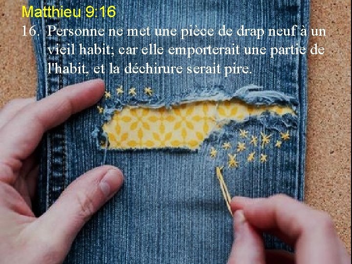 Et personne ne pose une pièce d’étoffe neuve sur un vieux vêtement, car le morceau ajouté tire sur le vêtement, et la déchirure s’agrandit.