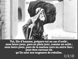 Toi, fils d’homme, prépare-toi un sac d’exilé ; sous leurs yeux, pars en plein jour, comme un exilé ; sous leurs yeux, pars de ta maison vers un autre lieu ; peut-être verront-ils qu’ils sont une engeance de rebelles.