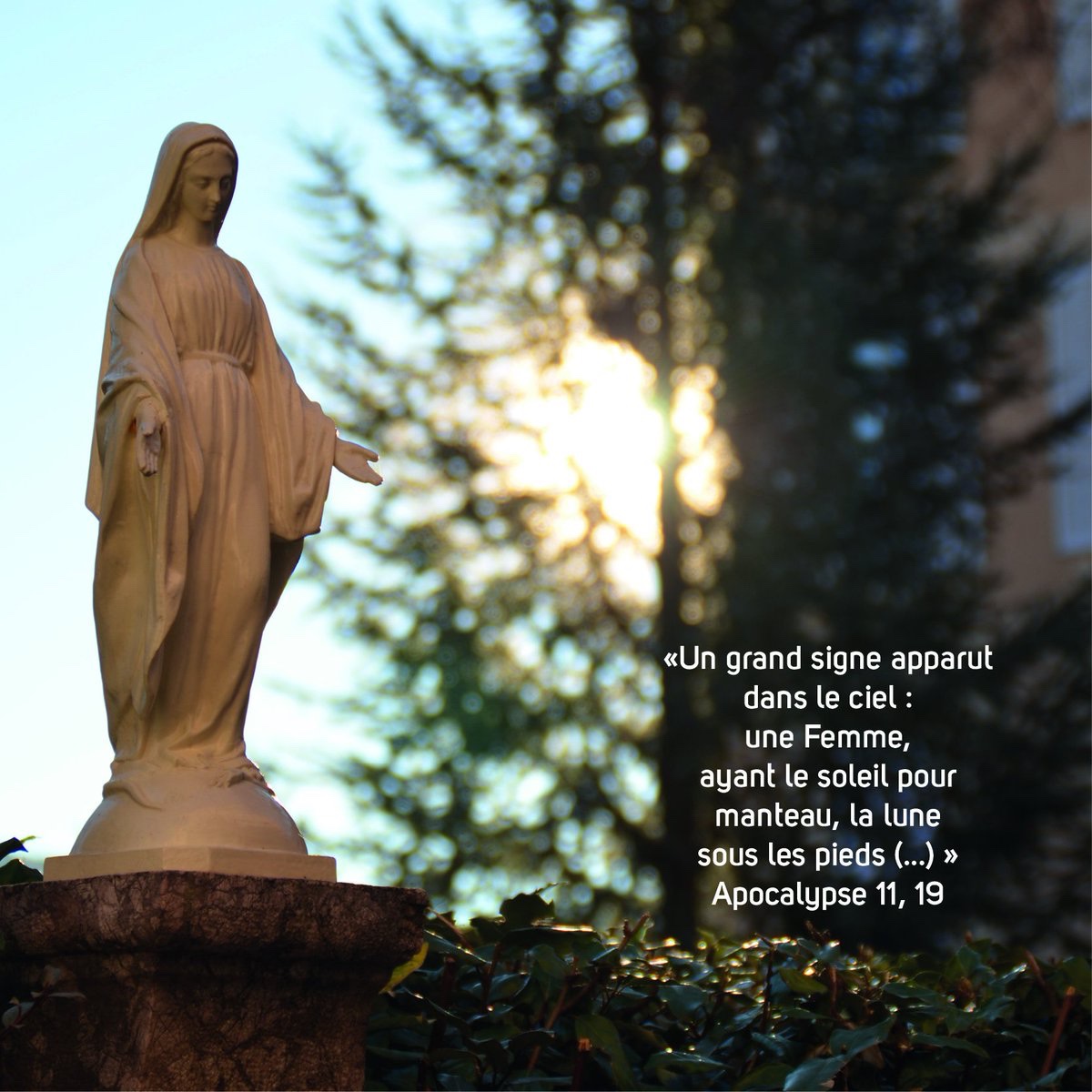 Un grand signe apparut dans le ciel : une Femme, ayant le soleil pour manteau, la lune sous les pieds, et sur la tête une couronne de douze étoiles.