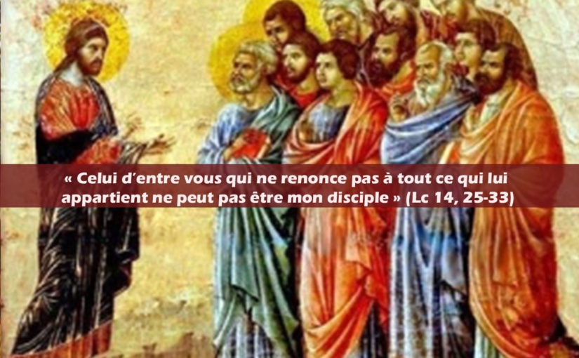 Cette Sagesse de Dieu nous est également révélée dans l’Évangile de ce dimanche. Les paroles que nous y avons entendues sont déroutantes. Jésus nous invite à l’aventure. Il nous demande un vrai saut dans l’inconnu. Si nous voulons être ses disciples, il nous faut accepter les conditions qu’il pose : “Si quelqu’un vient à moi sans me préférer à son père, sa mère, sa femme, ses frères, ses sœurs et même à sa propre vie, il ne peut pas être mon disciple.” Ce qui est premier, c’est de laisser le Christ remplir notre vie de l’amour qui est en lui. Nos affections naturelles sont limitées et imparfaites. Elles sont souvent mêlées d’égoïsme. Le Seigneur nous demande d’y renoncer pour accueillir son amour désintéressé et intensément généreux.