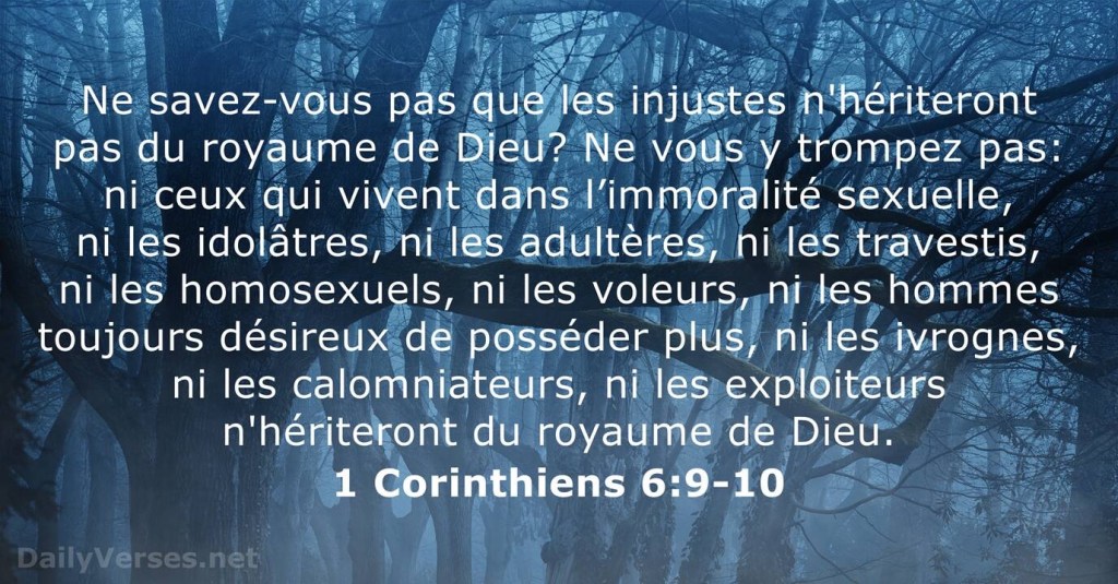 Ne savez-vous pas que ceux qui commettent l’injustice ne recevront pas le royaume de Dieu en héritage ? Ne vous y trompez pas : ni les débauchés, les idolâtres, les adultères, ni les dépravés et les sodomites,