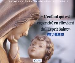 Comme il avait formé ce projet, voici que l’ange du Seigneur lui apparut en songe et lui dit : « Joseph, fils de David, ne crains pas de prendre chez toi Marie, ton épouse, puisque l’enfant qui est engendré en elle vient de l’Esprit Saint ;