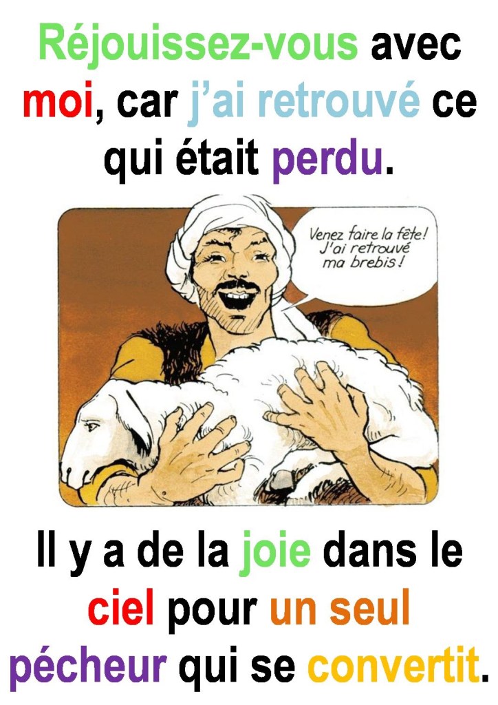 et, de retour chez lui, il rassemble ses amis et ses voisins pour leur dire : “Réjouissez-vous avec moi, car j’ai retrouvé ma brebis, celle qui était perdue !”