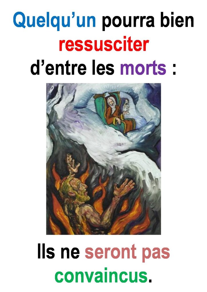 Abraham répondit : “S’ils n’écoutent pas Moïse ni les Prophètes, quelqu’un pourra bien ressusciter d’entre les morts : ils ne seront pas convaincus.” »