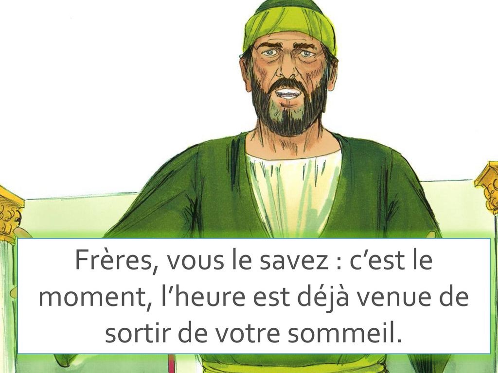 Frères, vous le savez : c’est le moment, l’heure est déjà venue de sortir de votre sommeil. Car le salut est plus près de nous maintenant qu’à l’époque où nous sommes devenus croyants.