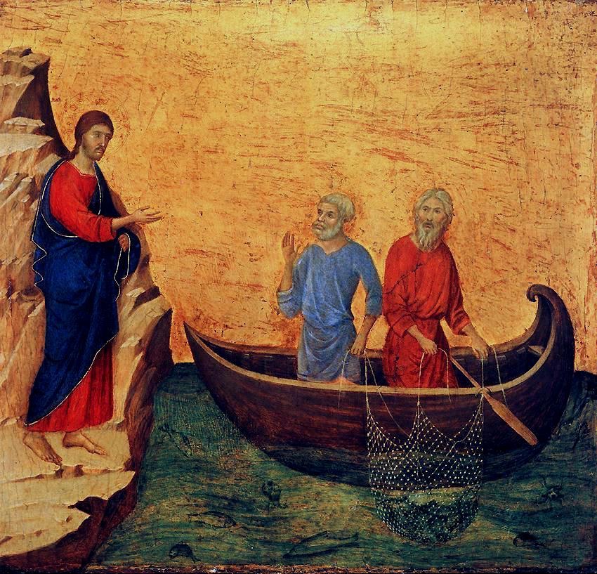 Deuxième volet du diptyque, l’appel des premiers disciples. Eux aussi sont Galiléens, de simples pêcheurs au bord du Lac de Capharnaüm. Aux yeux des élites juives, tous ces gens sont donc méprisables. D’emblée est posée une constante qui parcourt tout l’Évangile : c’est par les tout-petits, les gens méprisables qu’advient le salut.