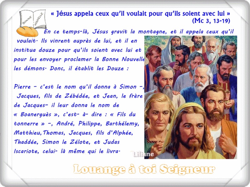 et il en institua douze pour qu’ils soient avec lui et pour les envoyer proclamer la Bonne Nouvelle