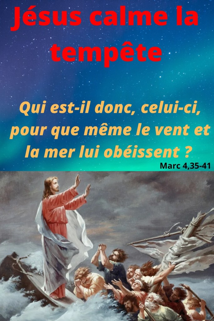 Réveillé, il menaça le vent et dit à la mer : « Silence, tais-toi ! » Le vent tomba, et il se fit un grand calme.