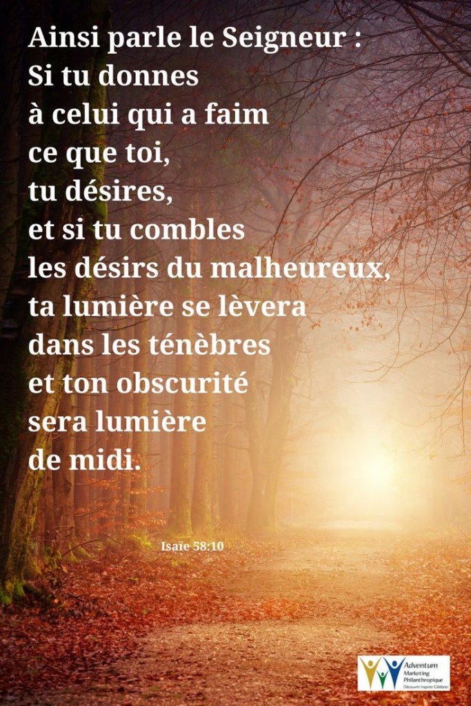 si tu donnes à celui qui a faim ce que toi, tu désires, et si tu combles les désirs du malheureux, ta lumière se lèvera dans les ténèbres et ton obscurité sera lumière de midi.