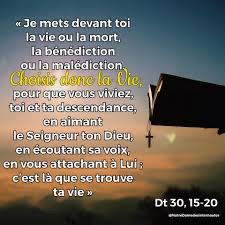 Je prends aujourd’hui à témoin contre vous le ciel et la terre : je mets devant toi la vie ou la mort, la bénédiction ou la malédiction. Choisis donc la vie, pour que vous viviez, toi et ta descendance,