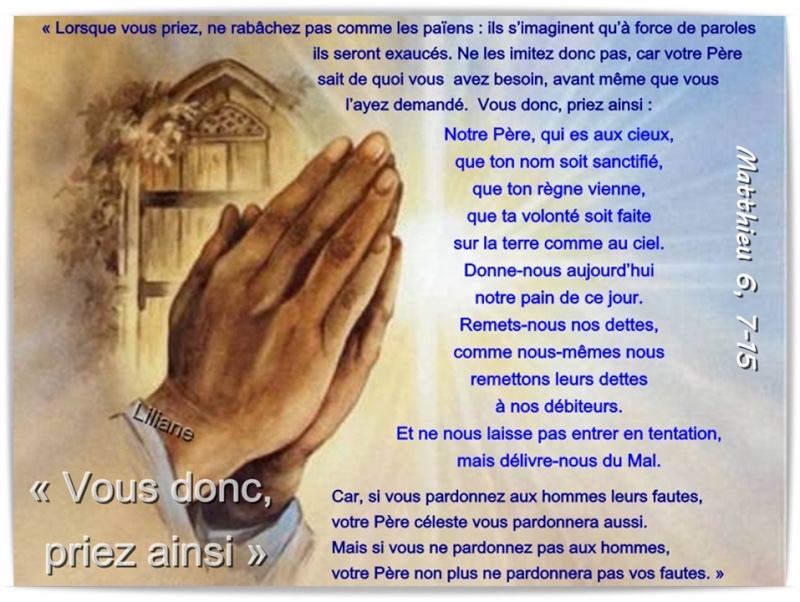 Vous donc, priez ainsi : Notre Père, qui es aux cieux, que ton nom soit sanctifié,