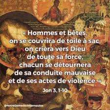 Hommes et bêtes, on se couvrira de toile à sac, on criera vers Dieu de toute sa force, chacun se détournera de sa conduite mauvaise et de ses actes de violence.