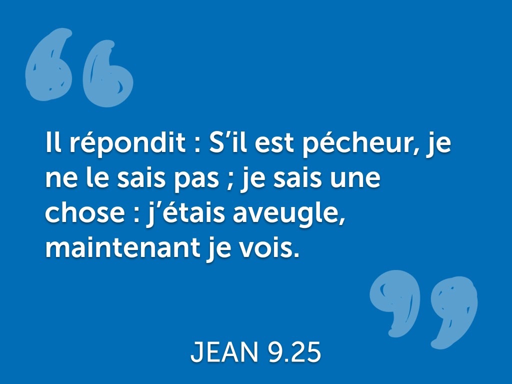 Il répondit : « Est-ce un pécheur ? Je n’en sais rien. Mais il y a une chose que je sais : j’étais aveugle, et à présent je vois. »