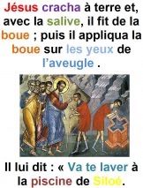Il répondit : « L’homme qu’on appelle Jésus a fait de la boue, il me l’a appliquée sur les yeux et il m’a dit : “Va à Siloé et lave-toi.” J’y suis donc allé et je me suis lavé ; alors, j’ai vu. »