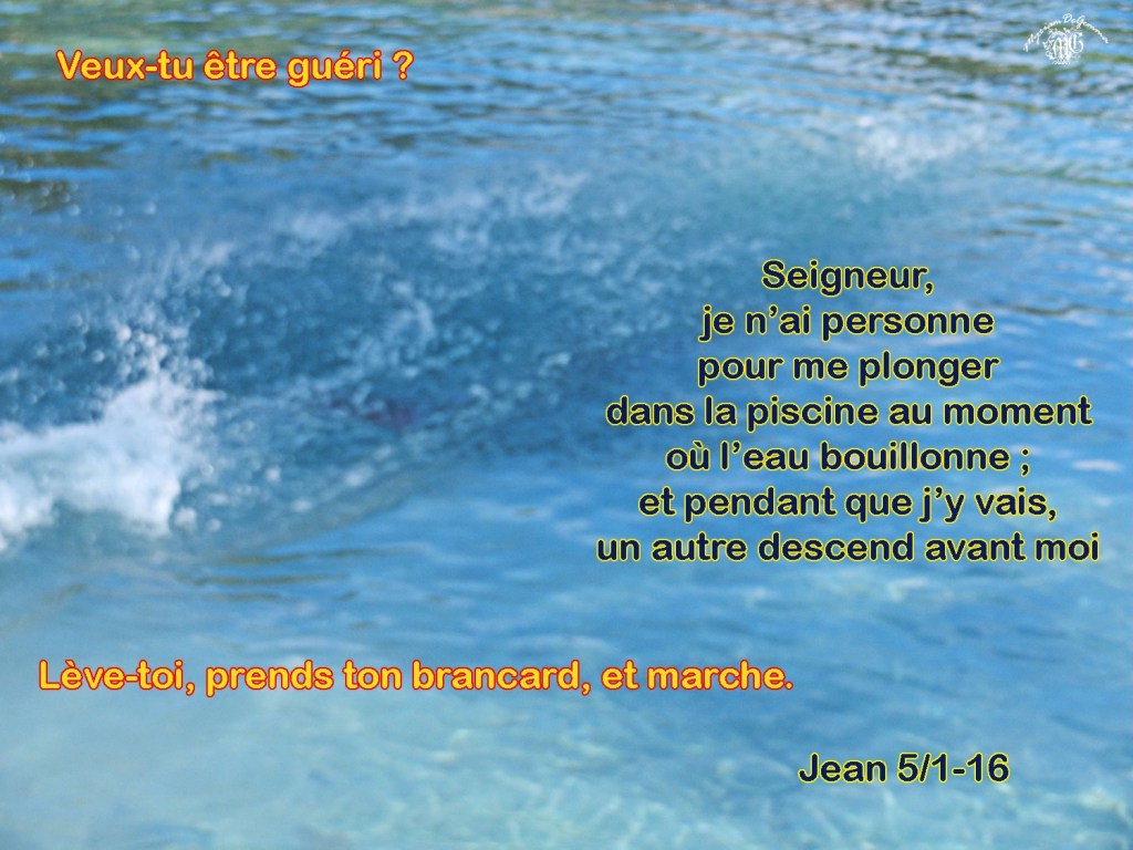 Le malade lui répondit : « Seigneur, je n’ai personne pour me plonger dans la piscine au moment où l’eau bouillonne ; et pendant que j’y vais, un autre descend avant moi. »