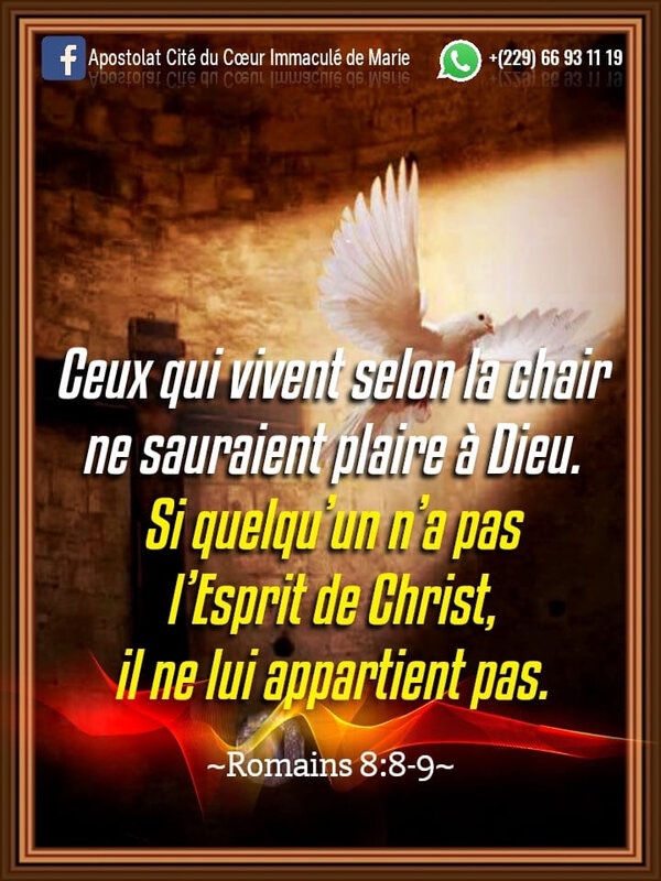 Or, vous, vous n’êtes pas sous l’emprise de la chair, mais sous celle de l’Esprit, puisque l’Esprit de Dieu habite en vous. Celui qui n’a pas l’Esprit du Christ ne lui appartient pas.
