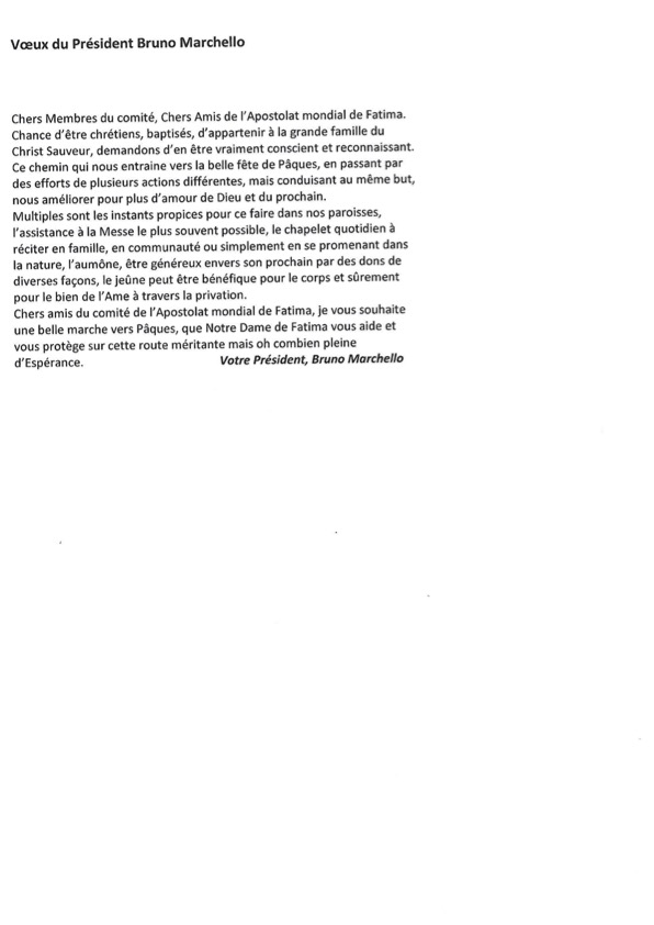 VOEUX DE PÂQUES DU PRÉSIDENT BRUNO MARCHELLO 31 mars 2023 ndfatima Partager : Cliquer pour partager sur X(ouvre dans une nouvelle fenêtre) X Cliquez pour partager sur Facebook(ouvre dans une nouvelle fenêtre) Facebook Plus Cliquez pour partager sur WhatsApp(ouvre dans une nouvelle fenêtre) WhatsApp Cliquer pour envoyer un lien par e-mail à un ami(ouvre dans une nouvelle fenêtre) E-mail J’aime chargement… Publié par ndfatima Administrateur Voir tous les articles par ndfatima