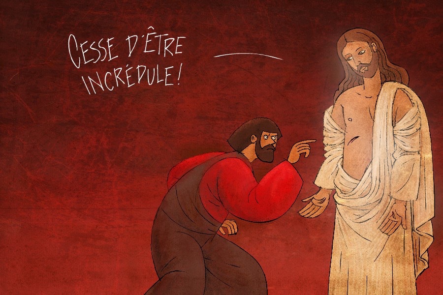 Huit jours plus tard, les disciples se trouvaient de nouveau dans la maison, et Thomas était avec eux. Jésus vient, alors que les portes étaient verrouillées, et il était là au milieu d’eux. Il dit : « La paix soit avec vous ! »