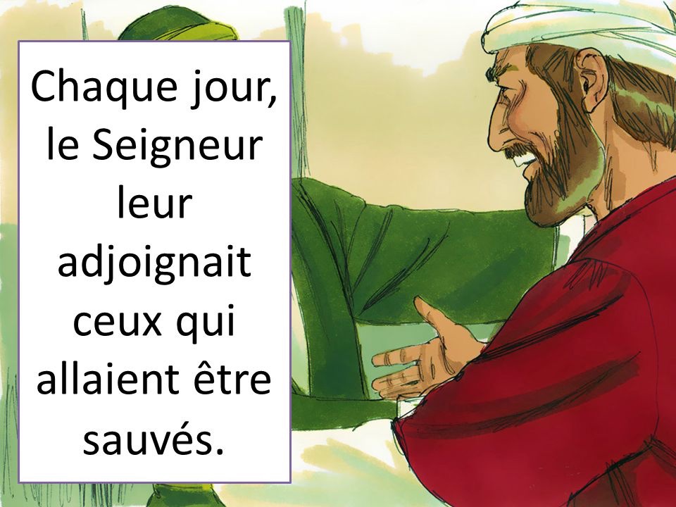 ils louaient Dieu et avaient la faveur du peuple tout entier. Chaque jour, le Seigneur leur adjoignait ceux qui allaient être sauvés.
