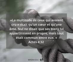 La multitude de ceux qui étaient devenus croyants avait un seul cœur et une seule âme ; et personne ne disait que ses biens lui appartenaient en propre, mais ils avaient tout en commun.