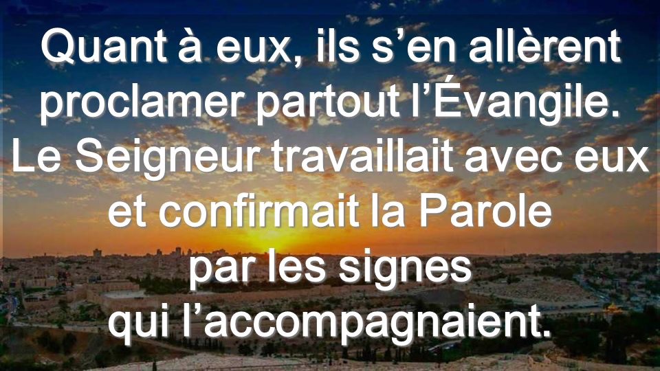 Quant à eux, ils s’en allèrent proclamer partout l’Évangile. Le Seigneur travaillait avec eux et confirmait la Parole par les signes qui l’accompagnaient.