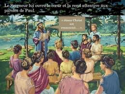 L’une d’elles nommée Lydie, une négociante en étoffes de pourpre, originaire de la ville de Thyatire, et qui adorait le Dieu unique, écoutait. Le Seigneur lui ouvrit l’esprit pour la rendre attentive à ce que disait Paul.