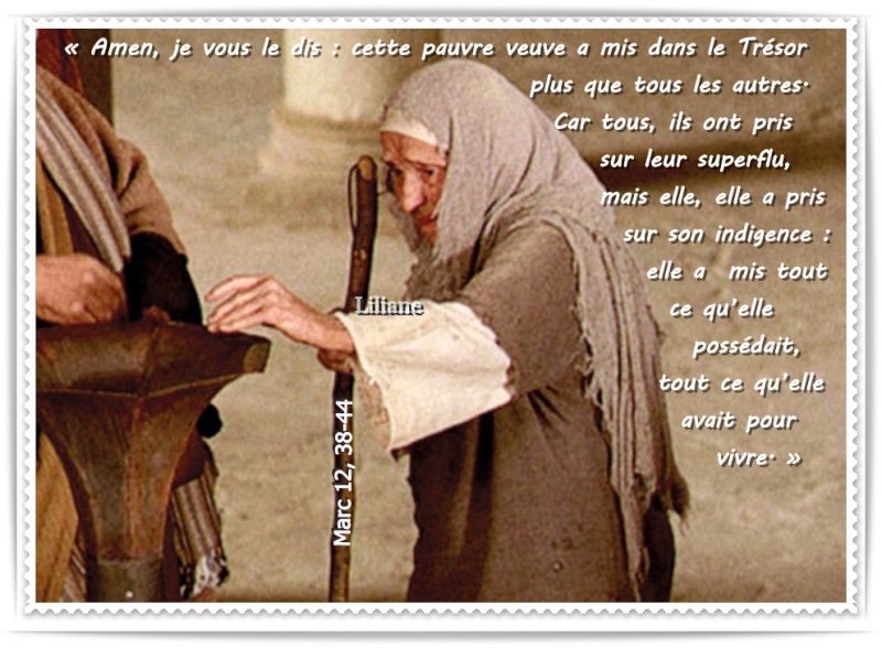 Car tous, ils ont pris sur leur superflu, mais elle, elle a pris sur son indigence : elle a mis tout ce qu’elle possédait, tout ce qu’elle avait pour vivre. »