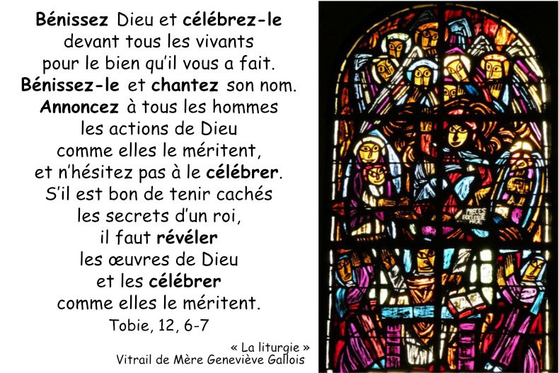 Alors l’ange les prit tous deux à part et leur dit : « Bénissez Dieu et célébrez-le devant tous les vivants pour le bien qu’il vous a fait. Bénissez-le et chantez son nom. Annoncez à tous les hommes les actions de Dieu comme elles le méritent, et n’hésitez pas à le célébrer.