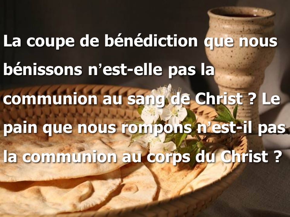 Frères, la coupe de bénédiction que nous bénissons, n’est-elle pas communion au sang du Christ ? Le pain que nous rompons, n’est-il pas communion au corps du Christ ?