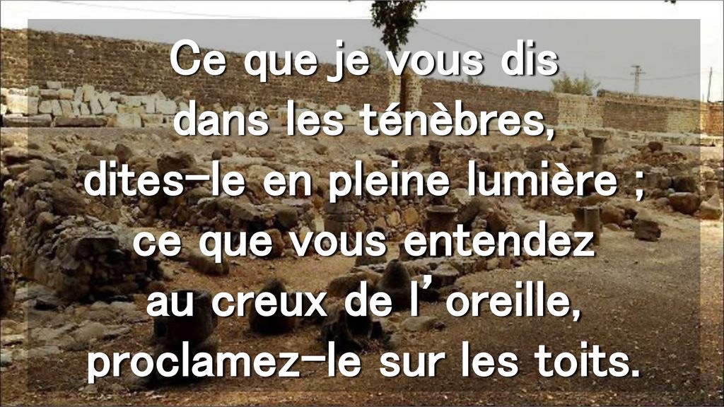 Ce que je vous dis dans les ténèbres, dites-le en pleine lumière ; ce que vous entendez au creux de l’oreille, proclamez-le sur les toits.