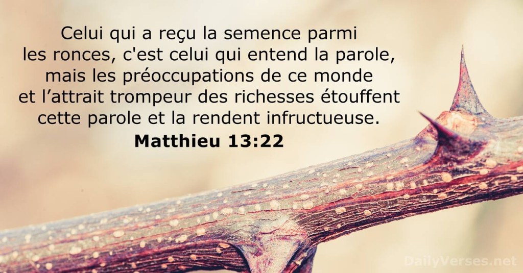 Celui qui a reçu la semence dans les ronces, c’est celui qui entend la Parole ; mais le souci du monde et la séduction de la richesse étouffent la Parole, qui ne donne pas de fruit.