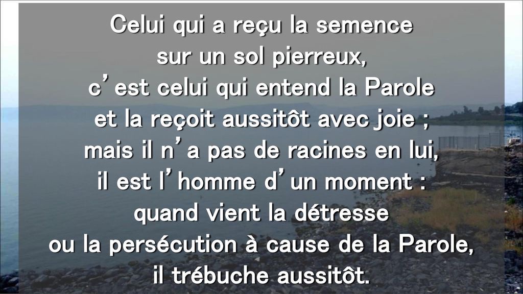 Celui qui a reçu la semence sur un sol pierreux, c’est celui qui entend la Parole et la reçoit aussitôt avec joie ;