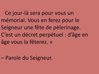 Ce jour-là sera pour vous un mémorial. Vous en ferez pour le Seigneur une fête de pèlerinage. C’est un décret perpétuel : d’âge en âge vous la fêterez. »