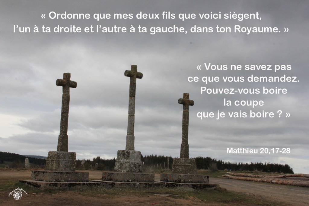 Il leur dit : « Ma coupe, vous la boirez ; quant à siéger à ma droite et à ma gauche, ce n’est pas à moi de l’accorder ; il y a ceux pour qui cela est préparé par mon Père. »