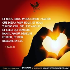 Et nous, nous avons reconnu l’amour que Dieu a pour nous, et nous y avons cru. Dieu est amour : qui demeure dans l’amour demeure en Dieu, et Dieu demeure en lui.